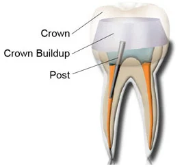 In restoring a tooth without sufficient structure, we may need to use further support for the tooth using a small metallic rod called a post, which protrudes from the root a few millimeters. A core or filling is then used to secure the rod in place.